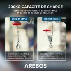 L’AR-HE-SW100 vous permet de soulever facilement des charges de 100 Ă 200 kg, selon que vous l’utilisez comme palan Ă câble simple (sans poulie) ou palan Ă câble double avec la poulie fournie.