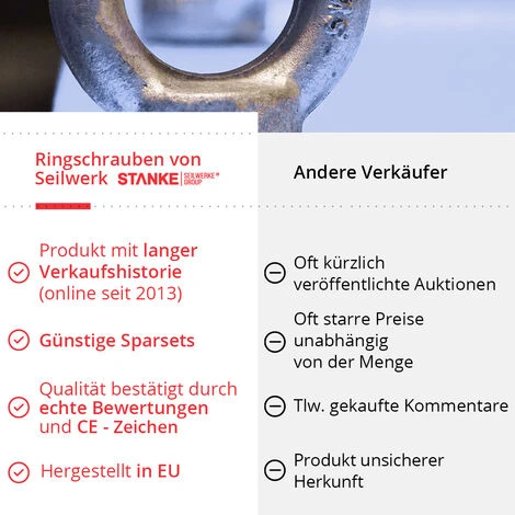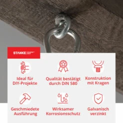 Le boulon ? ?il Seilwerk STANKE est utilisĂ© pour suspendre et soulever des objets. Le produit convient aux câbles naturels, synthĂ©tiques et d’acier, ainsi qu’aux accessoires nĂ©cessaires (cosses, mousquetons, tendeurs). L’Ă©lĂ©ment a un filetage mĂ©trique, une bride et un ?illet rond. La structure n’est pas pliĂ©e, ce qui influence en outre sa soliditĂ©. La surface du boulon d’oreille STANKE est bien finie et ne prĂ©sente pas d’ar?tes vives, c’est pourquoi le produit est parfait pour les projets de bricolage ? la maison et au jardin.