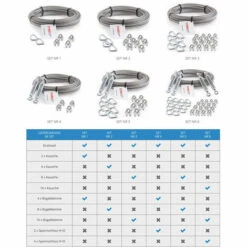 - Un set comprend : Câble d’acier galvanisĂ© en couche PVC 2mm 1×19, 4x Cosse-c?ur, 8x Serre-câble ? Ă©triere – SET 2